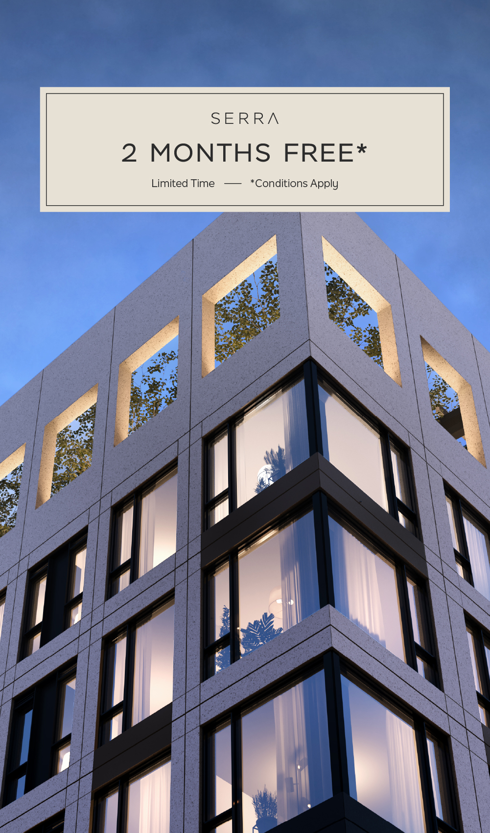 Located in the heart of downtown Montréal, SERRA offers 245 new apartments for rent, from studios to two-bedrooms. Each unit showcases a sophisticated architectural concept inspired by nature, with timeless design, natural materials, and bright, open spaces. Apartments overlooking the courtyard and its expansive garden create a calm retreat in the city. With a 12-month minimum lease, SERRA is ideal for students, young professionals, couples, and families seeking comfort and convenience in Montréal’s vibrant urban core.